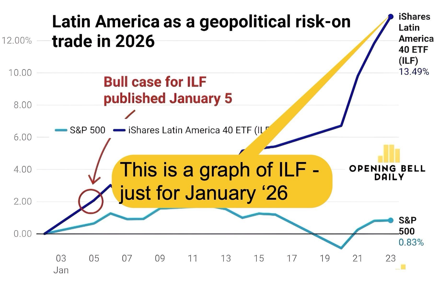 Tip #1 – ILF: Up ~13.5% since Maduro’s capture … ILF has shifted from a headline spike to a structural geopolitical risk-on trade. Strength is driven by the metals rally and Brazil’s heavy weighting (over 50%) – as they are a major producer of real-economy commodities like niobium. Momentum was reinforced by last week’s EU-Mercosur trade deal, creating a $22T economic bloc that gives Europe direct access to Latin America – bypassing the U.S./China trade frictions. If it holds, Brazil’s minerals and Argentina’s agriculture will flow freely.